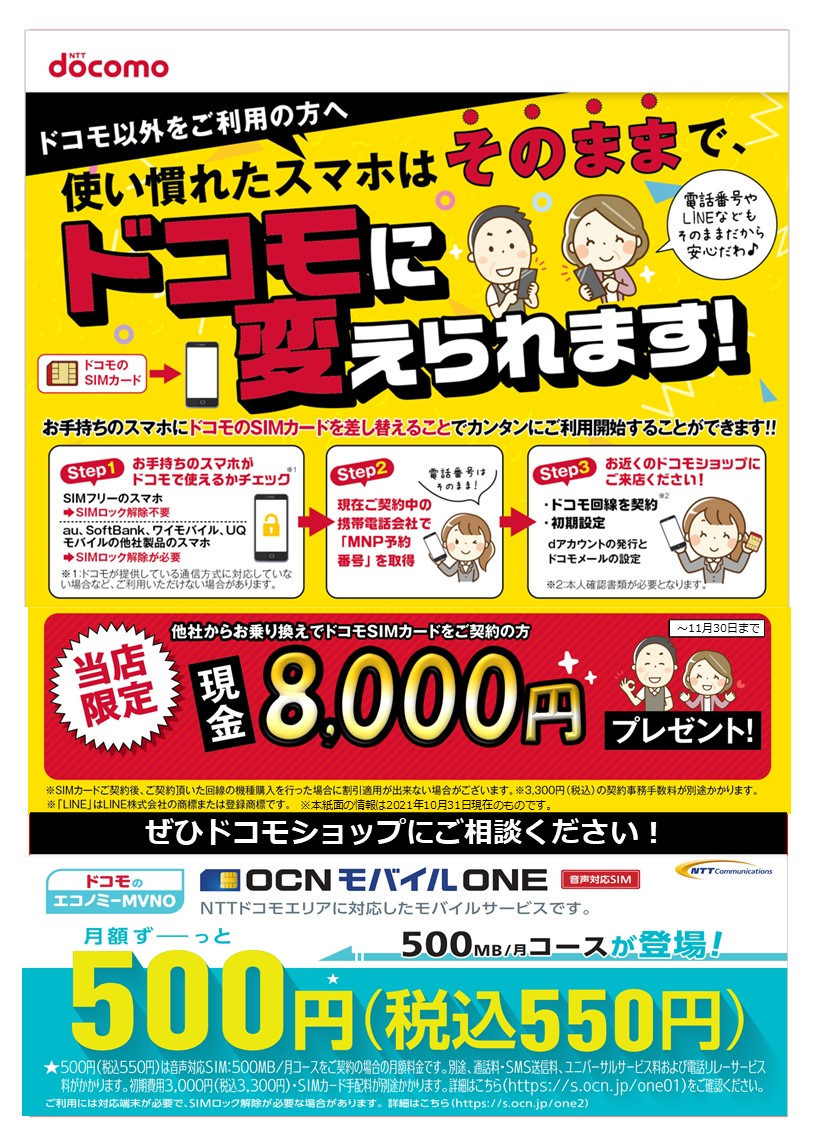 携帯電話・スマートフォンの買い替えをまだご検討でない方、ドコモをご利用でない方も、お気軽にお立ち寄りください。料金相談やスマホ除菌も行います。