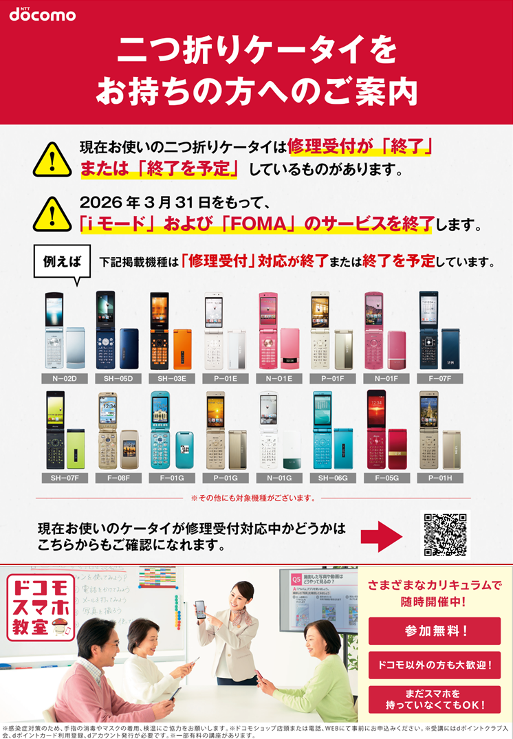 携帯電話・スマートフォンの買い替えをまだご検討でない方、ドコモをご利用でない方も、お気軽にお立ち寄りください。料金相談やスマホ除菌も行います。