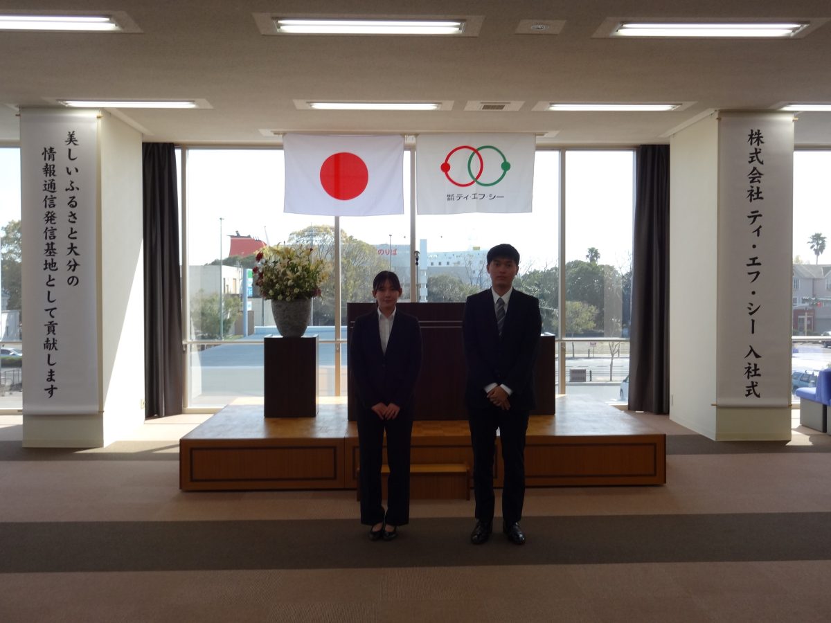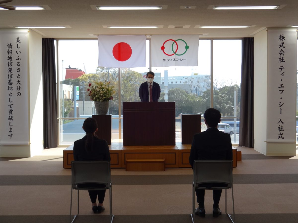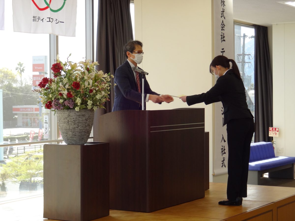 式辞があり、新入社員が「人一倍努力をし、何事にも全力で取り組みます」と誓いの言葉を述べました。